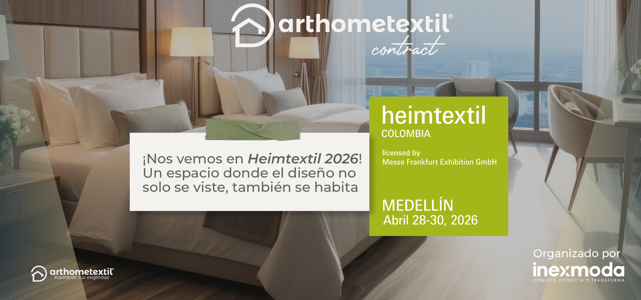 En este contexto, HEIMTEXTIL 2026, Colombia se convierte en el escenario ideal para conectar estas oportunidades. Desde Arthometextil y Arthometextil contract, ponemos al servicio del mercado nuestra experiencia en textiles especializados para proyectos hoteleros, ofreciendo soluciones tanto para diseñadores y desarrolladores —con portafolios técnicos de alto desempeño— como para empresas que buscan productos terminados con estándares profesionales. Así, acompañamos la evolución del sector, atendiendo tanto a hoteles como al creciente mercado de alojamientos alternativos, llevando diseño, tecnología y funcionalidad a un nuevo nivel.